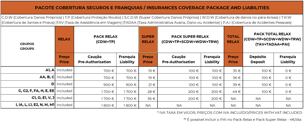 a) Pack Relax, inclui CDW e TP. É aplicável uma caução equivalente à franquia obrigatória contratada cujo valor está disponível na Tabela de Cobertura de Seguros e Franquias em vigor;